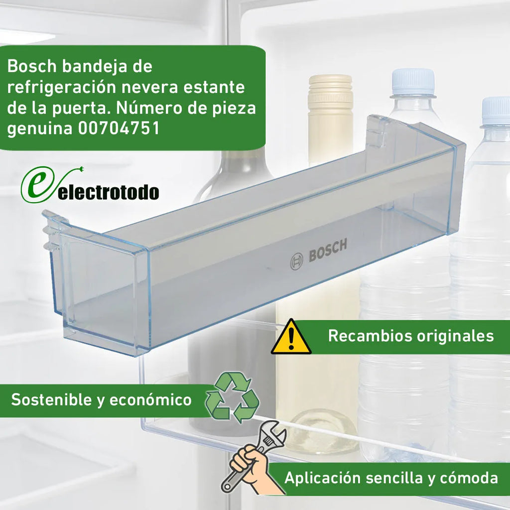 Taca na butelki do lodówki Bosch. Ten element zamienny montuje się na dolnej części drzwi lodówki, a w niektórych modelach także na środkowej części drzwi. Jeśli mają Państwo wątpliwości, który zamiennik jest odpowiedni dla Państwa urządzenia, prosimy o kontakt, nasi technicy z obsługi klienta chętnie pomogą.