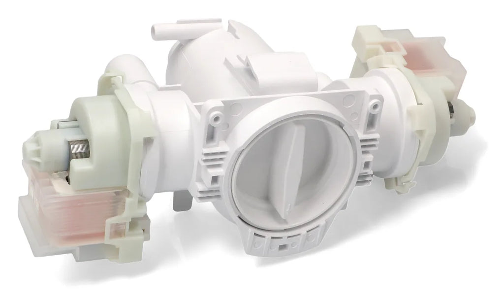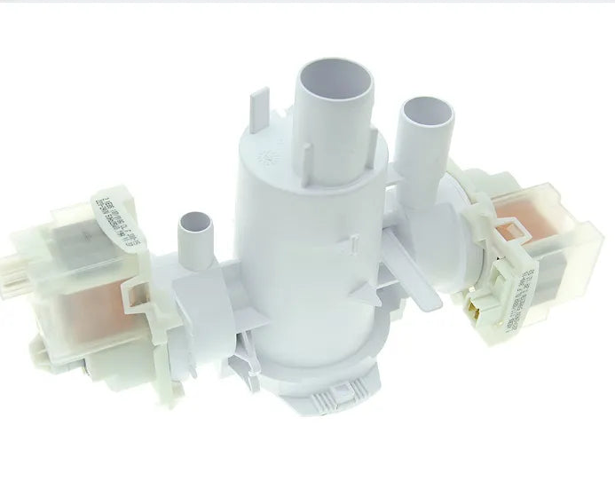 Pompa do pralki Fagor, Edesa, Aspes. Z filtrem. Podwójna pompa do odprowadzania wody i cyrkulacji. Rury o średnicy Ø 32, 25 i 16 mm. Pompa pralki ulega awarii, gdy przestaje odprowadzać wodę lub gdy urządzenie przestaje działać podczas prania w fazie odprowadzania. Czasami awaria ta poprzedzona jest dziwnym dźwiękiem podczas odprowadzania wody z urządzenia. Regularnie sprawdzaj stan filtra, aby uniknąć awarii.
