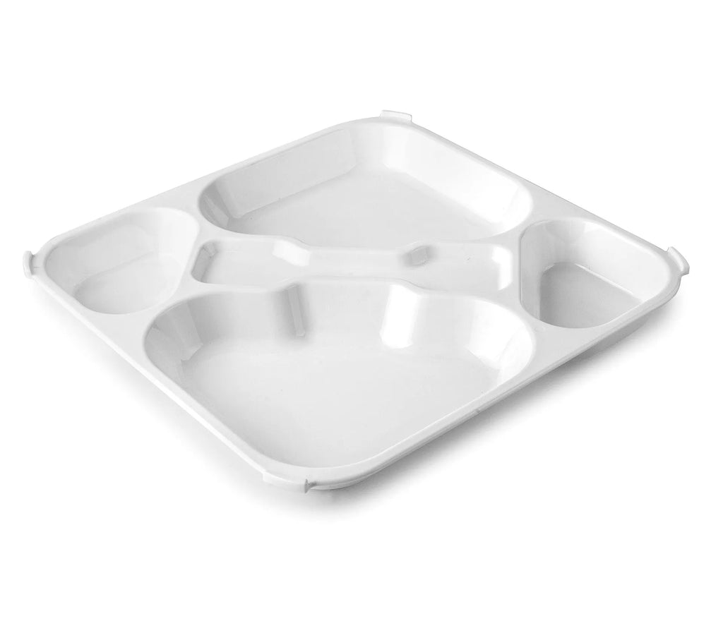 4 przegródki na jedzenie i 1 na sztućce.