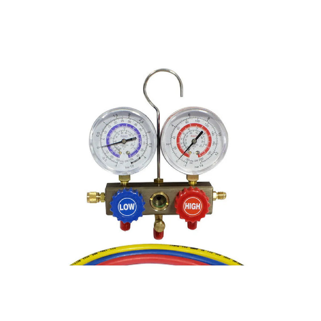 UNIWERSALNY zestaw rozdzielaczy 2-drożny - R600 to kolektor manometrów Uniwersalny zaprojektowany dla profesjonalistów w dziedzinie chłodnictwa, klimatyzacji i wentylacji. Ten dwudrożny zestaw manometryczny jest idealny do pracy z czynnikami chłodniczymi R600, R600a i R290, powszechnie stosowanymi w systemach zamrażarek i lodówek. Jego solidna konstrukcja obejmuje 2 zawory i manometry o średnicy 68 mm, zapewniając precyzyjne pomiary. Jest to niezbędne narzędzie do konserwacji i napełniania systemów chłodniczych, gwarantujące optymalną wydajność i długą żywotność.