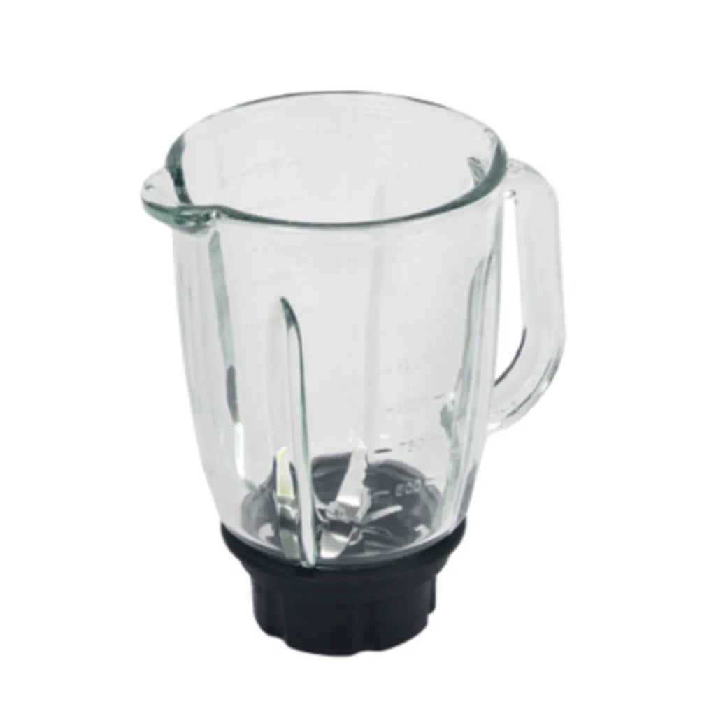 Dzbanek do blendera Moulinex Mastermix. Oryginalna część zamienna. Nagłe zmiany temperatury mogą spowodować pęknięcia szkła dzbanka. Zawiera podstawę i ostrze urządzenia.
