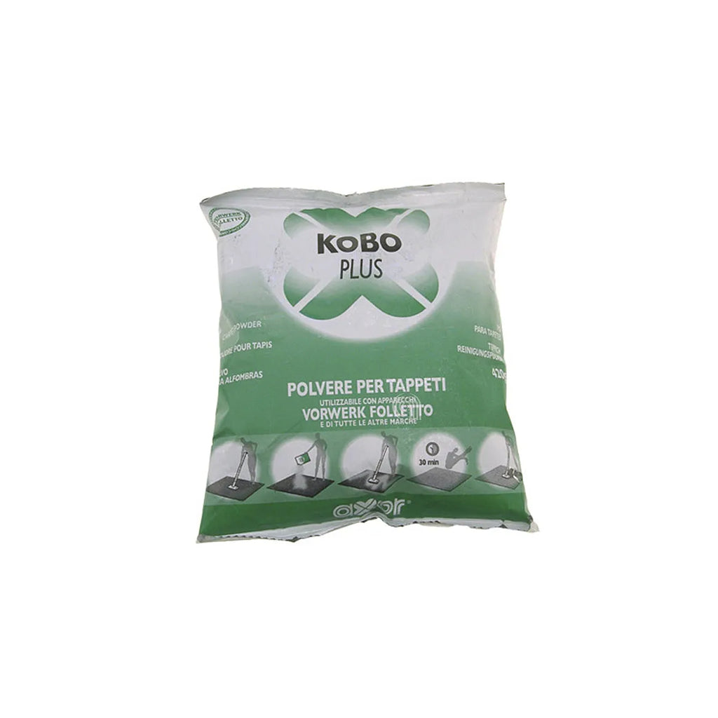 VORWERK-FOLLETTO, VORWERK Proszek do dywanów Kobosan Active Kobo Plus, produkt dostosowany do głębokiego czyszczenia dywanów i wykładzin. Jego formuła z włókien celulozy naturalnej pochłania brud i kurz wnikający głęboko, którego zwykłe odkurzanie nie usuwa. Idealny do utrzymania świeżości i czystości powierzchni tekstylnych, zmniejszając powstawanie alergenów. Kompatybilny z odkurzaczami Vorwerk Folletto oraz innych marek. Opakowanie 420 g, wystarczające do oczyszczenia od 6 do 8 m² powierzchni. Numery referencyjne 01082 i 51391.