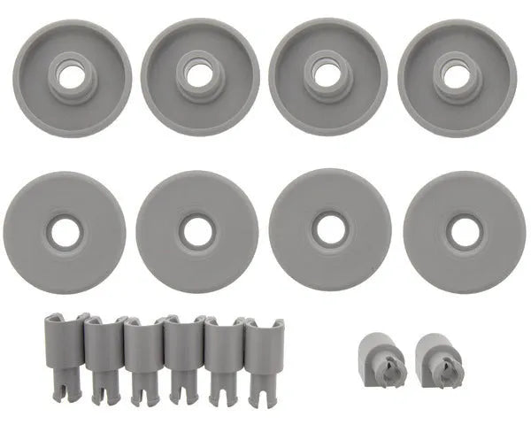 Zestaw kółek z uchwytem mocującym do dolnego kosza zmywarki. Zawiera 8 kółek. Oryginalne kody: 50286965004 (SZARY) i 50269971003 (BIAŁY). Te kółka są specjalnie zaprojektowane do dolnego kosza zmywarki, o średnicy: 40 mm, wysokości: 8 mm, kolorze: szarym, materiale: plastik.