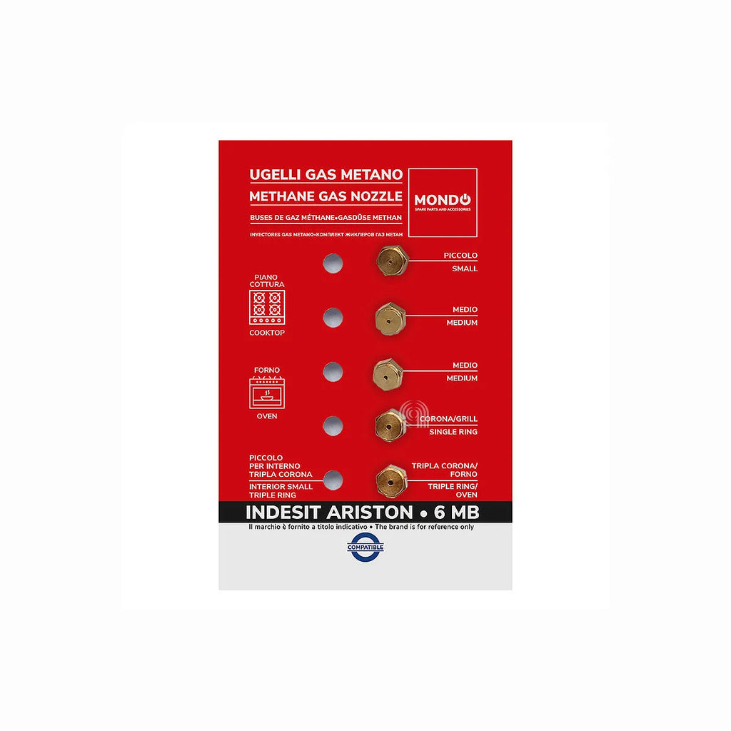 Ten zestaw 5 wtryskiwaczy gazu metanowego 6MB jest uniwersalny i kompatybilny z szeroką gamą płyt kuchennych marek takich jak ARISTON, INDESIT, MONDO. Idealny do wymiany uszkodzonych wtryskiwaczy lub do konwersji gazu. Zapewnia optymalną wydajność i stabilny płomień w Twojej kuchni. Główne oznaczenie: AST-00537556.