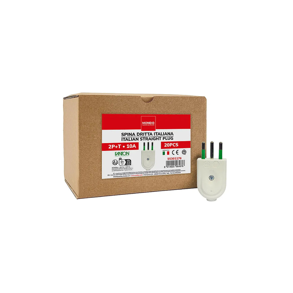 MONDO oferuje to opakowanie zawierające 20 włoskich wtyczek prostych 2P+T 10A, typu uniwersalnego, idealnych do małych urządzeń. Wykonane z jakości IMQ Made in Italy, te wtyczki są wszechstronną częścią zamienną do różnych zastosowań.